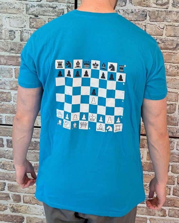 De terugkeer van een klassieker, in felblauw! Het ontwerp aan de achterkant is de welbekende bongcloud opening, met ons logo voorop.
